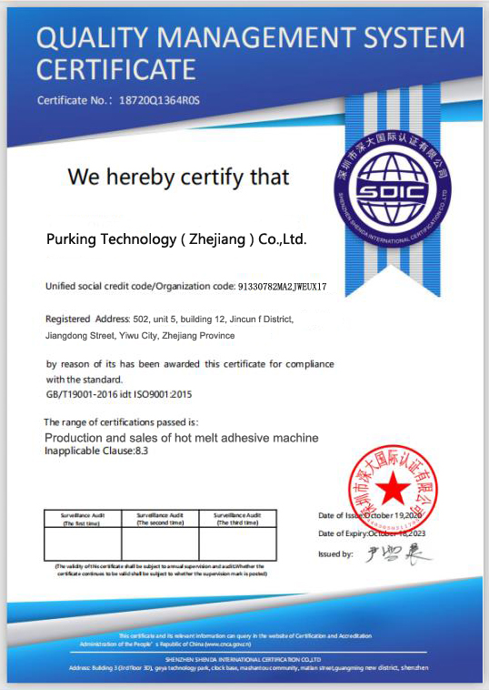 „Purking Technology“ (Zhejiang) Co, Ltdbuvo įkurta 2014 m., Tai yra profesionali karštojo lydymo mašinų gamybos įmonė, integruojanti mokslinius tyrimus, plėtrą, rinkodarą, personalo mokymą ir aptarnavimą po pardavimo. Bendrovė turi daugiau nei 1000 kvadratinių gamyklinių pastatų kvadratinių metrų. Bendrovės pardavimo būstinė yra Yiwu mieste, Džedziango provincijoje. Gamybos ir surinkimo centras yra Dongguan mieste, Guangdong provincijoje. |
